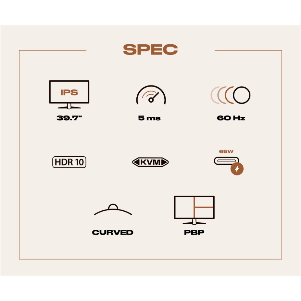 - Moniteur bureautique 39,7″ / Dalle IPS / résolution 5K2K (5120×2160) / Fréquence de rafraichissement 60Hz / temps de réponse 5 ms / 1,07 milliard de couleurs / 1 DP 1.4 / 1 HDMI 2.0 / KVM / USB C avec Charge jusqu’à 65W /