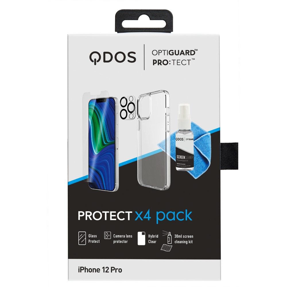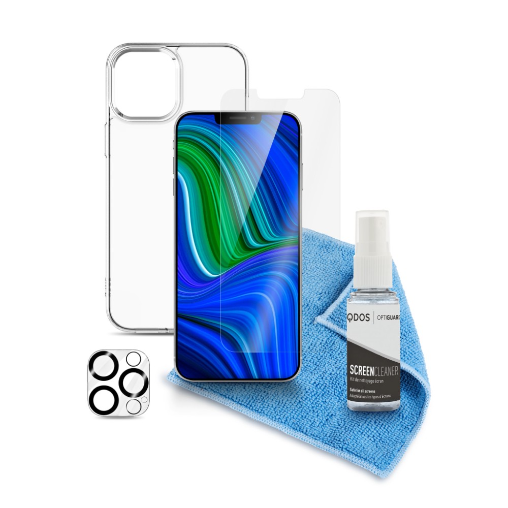 Protégez votre iPhone 12 Pro à 360° avec le PACK Protect 4 en 1 : protection objectif OptiGuard Camera Lens, coque HYBRID Clear, protection écran OptiGuard, kit de nettoyage