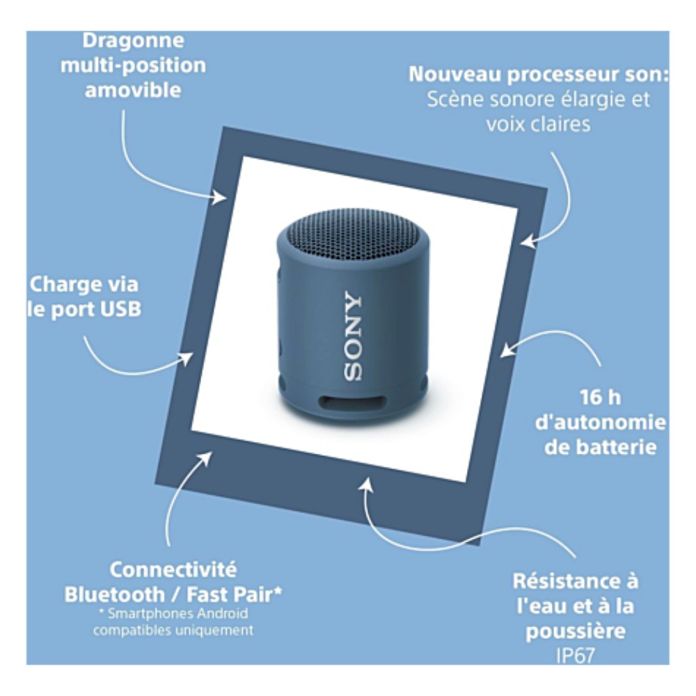 - La SRS-XB13 est compacte, légère et facile à transporter Elle est dotée d’une dragonne ajustable, détachable et très pratique pour transporter ou accrocher votre enceinte sans fil où vous le souhaitez Elle est disponible en 6 coloris fun et acidulés